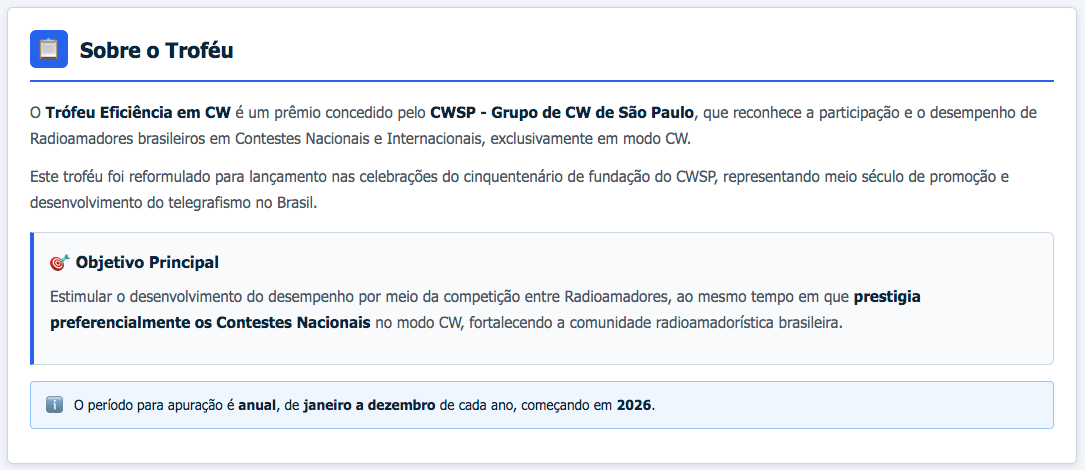 Será premiado como Vencedor, recebendo o Troféu Eficiência em CW o Radioamador que alcançar o maior Escore Final no período anual.