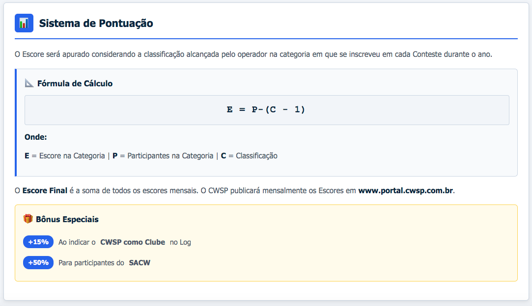 O Escore será apurado por uma Comissão do CWSP e se dará pela classificação alcançada pelo operador na categoria em que se inscreveu em cada Conteste durante o ano, da seguinte maneira: